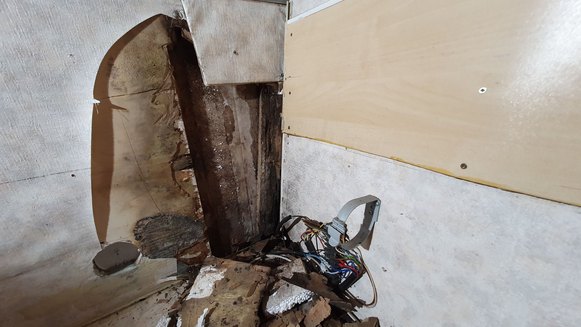 Das morsche Holz wird von innen entfernt und durch neue Holzleisten und Sperrholzplatten aus dem Baumarkt ersetzt (im Bild das hellere Holz). Als Kleber verwenden wir den "Caravan-Kleber" von technicoll. Holzschäden und Unebenheiten werden mit der Spachtelmasse von "Eazyfix" verspachtelt.
