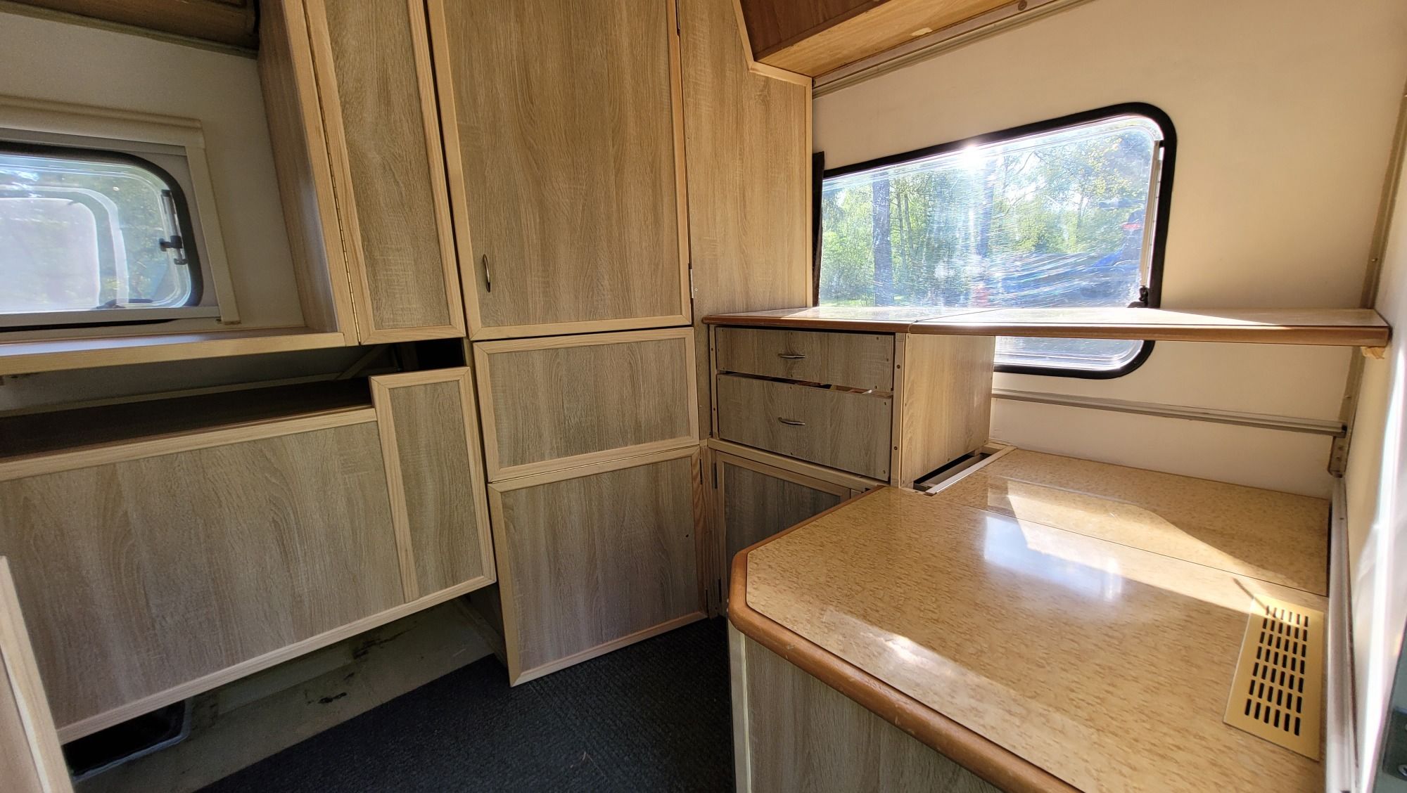 Der Schrank ist besonders stabil gefertigt, da er als Auflager für die Wohnwagen-Seitenwände, deren Gewicht bei der Fahrt aufnehmen muss.